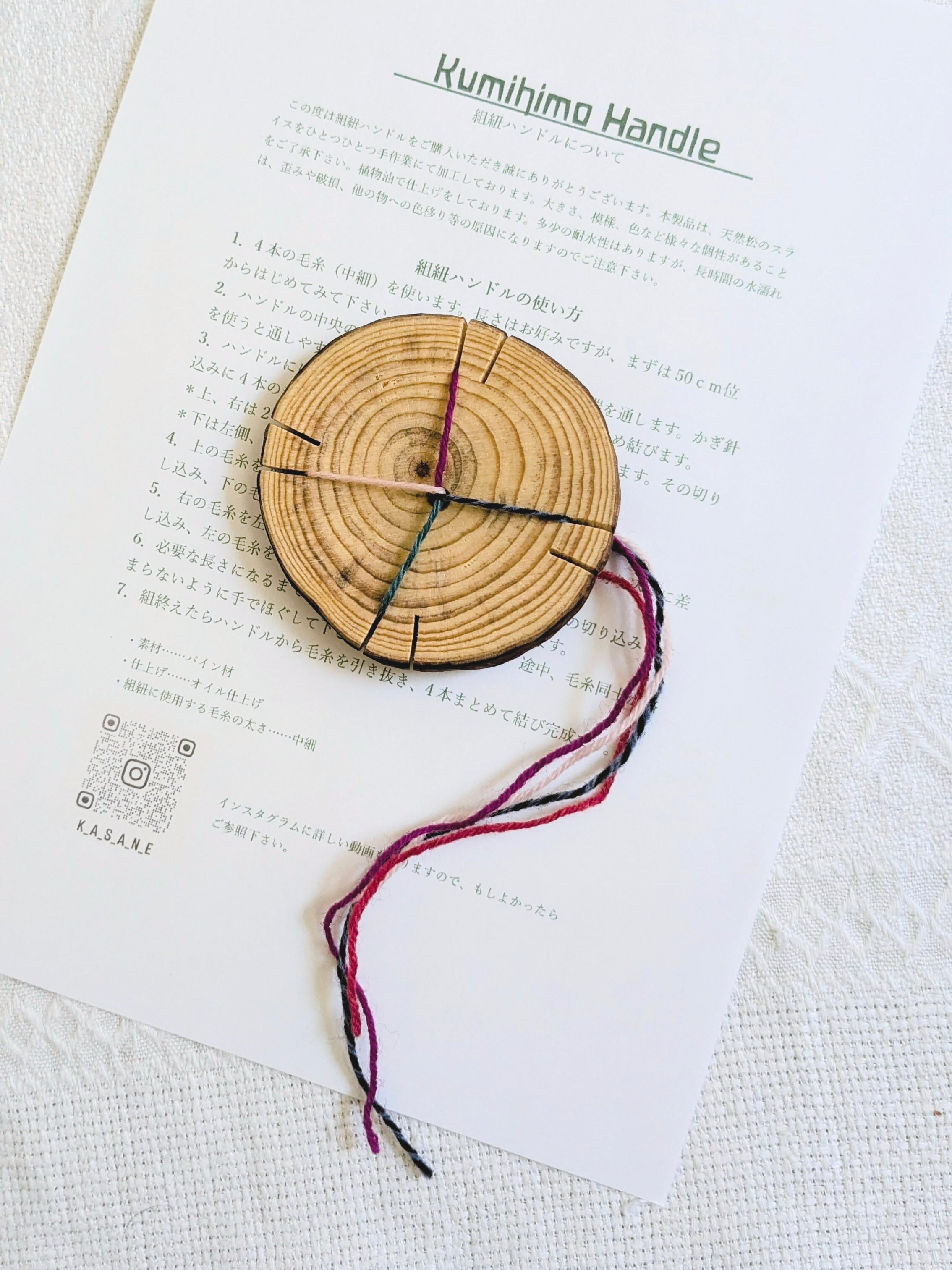 お家でたのしく組紐作りが出来る《組紐ハンドル》を作りました。国産の松の木を使用しています。ひとつひとつ違い、温かみのある道具に仕上がりました。
